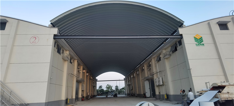 如圖所示,拱形屋頂已完全安裝完畢,山墻處的H鋼橫梁也已就位。下一步將安裝山墻板。所使用的山墻板為914-610型號(hào),采用直槽板設(shè)計(jì),經(jīng)過(guò)壓瓦機(jī)壓制而成,未進(jìn)行彎板加工,保持了結(jié)構(gòu)的簡(jiǎn)潔和實(shí)用性。