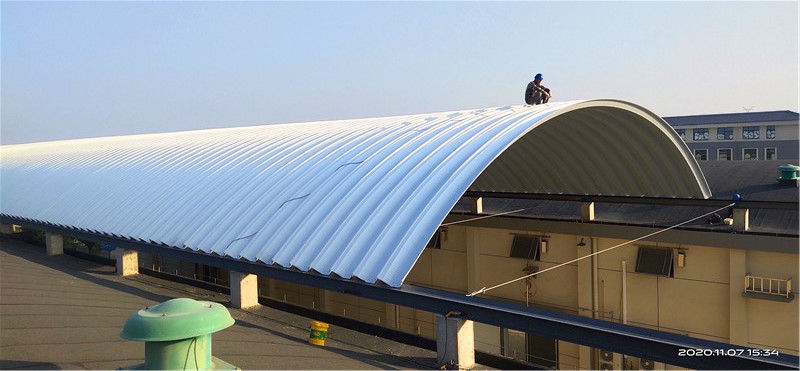 拱形屋面結(jié)構(gòu)廣泛應(yīng)用于糧食儲(chǔ)備庫(kù)等建筑中,因其采用彩色鍍鋅鋼板機(jī)械鎖邊連接,具有良好的自然防水性能,且外觀美觀、堅(jiān)固耐用,整體自重較輕,結(jié)構(gòu)科學(xué)合理,具備良好的抗風(fēng)抗震能力。此類屋面不僅抗風(fēng)抗雪性能突出,還能滿足較高的風(fēng)速和雪載要求,適合多種氣候環(huán)境。